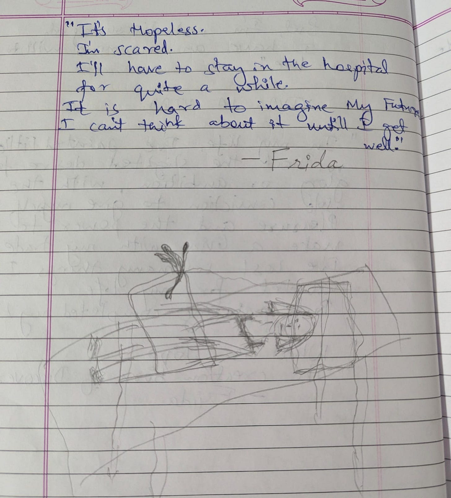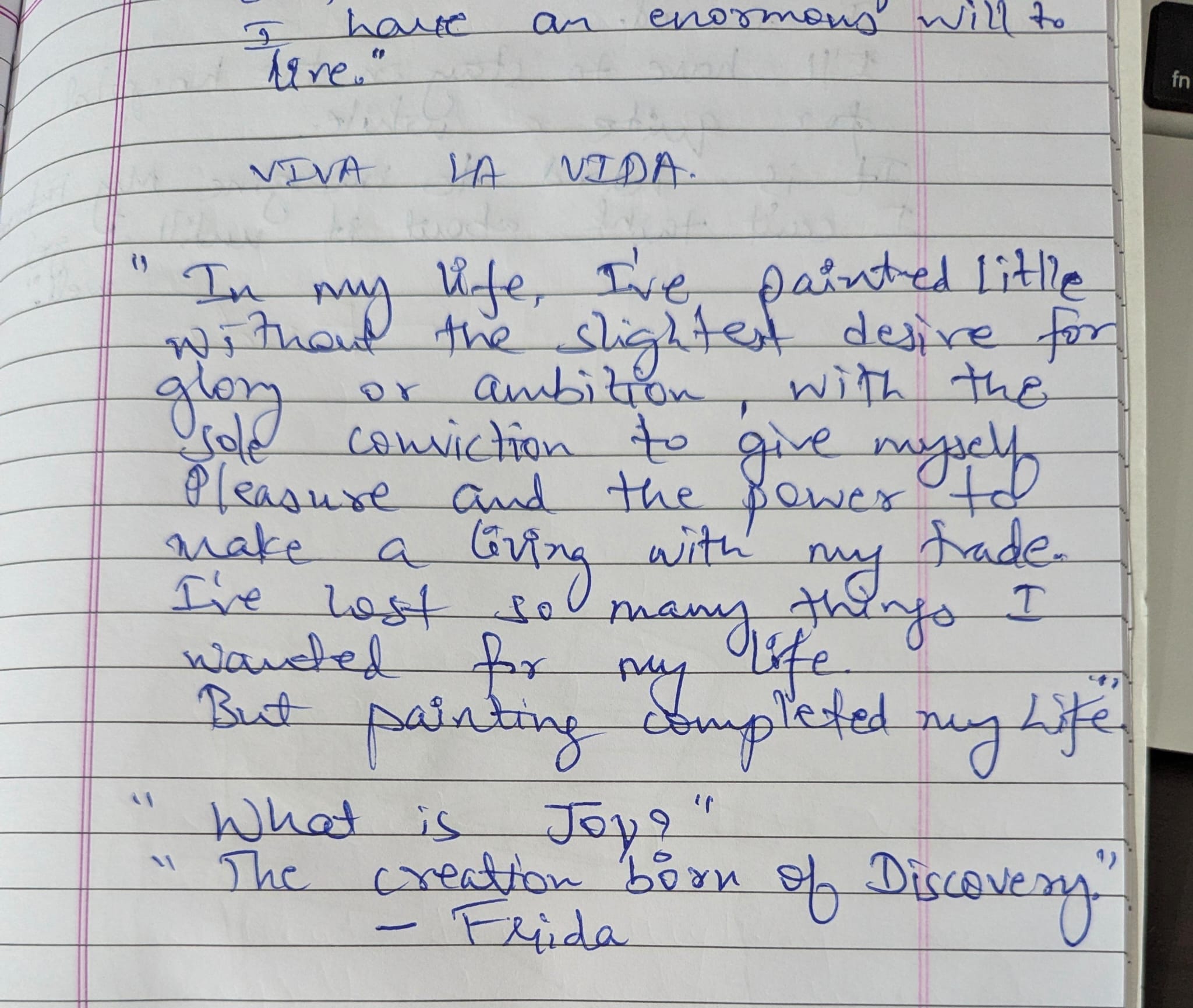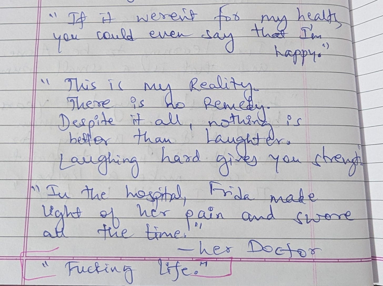 i watched it till lunch. i couldn’t eat much. then continued watching the documentary again. and, Frida’s life and her pain and her passion for painting made me write so many notes in my phone and in my notepad whenever i could sit up a bit.
